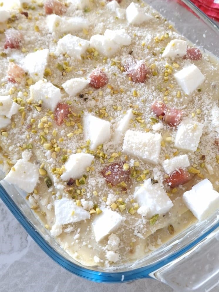 Sur la dernière couche, parsemez de beaucoup d’éclats de pistache et de parmesan râpé pour obtenir une croûte.
