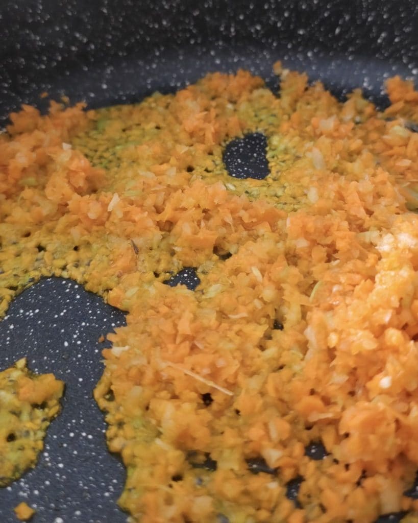 Hachez le céleri, la carotte et l’oignon, puis faites-les revenir dans une grande casserole avec un filet d’huile d’olive extra vierge.