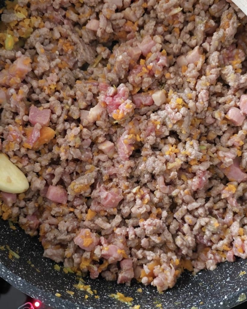 Ajoutez la viande hachée et faites cuire pendant environ 10 minutes, salez et poivrez ensuite versez le vin et laissez évaporer, salez, mélangez et continuez la cuisson pendant environ 40 minutes si nécessaire, ajoutez une louche de bouillon ou d’eau chaude.