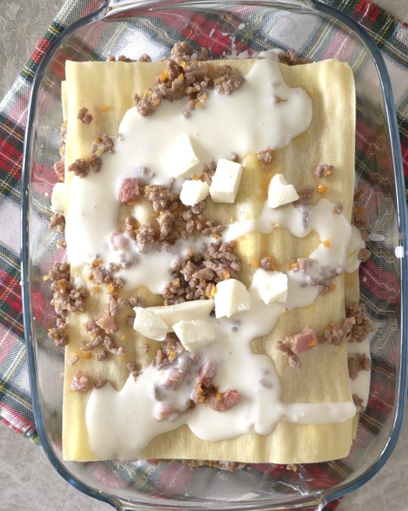Disposez au fond un peu de béchamel avec une cuillère puis une couche de pâte, le ragù et la mozzarella.
