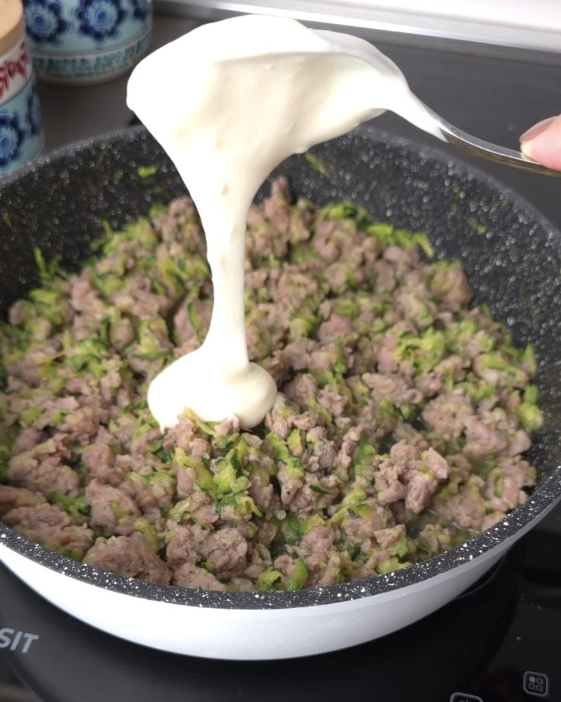 Ajoutez la saucisse émiettée et poursuivez la cuisson jusqu’à ce que la saucisse soit dorée. Une fois le temps de cuisson écoulé (environ 5 minutes), incorporez la béchamel et mélangez.