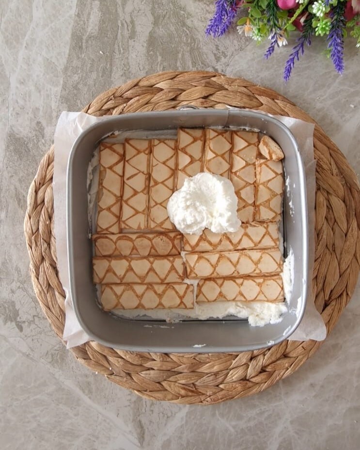 Déposez quelques cuillerées de crème sur un plat de 24×24 cm, ajoutez les petites feuilletés et une autre couche de crème.