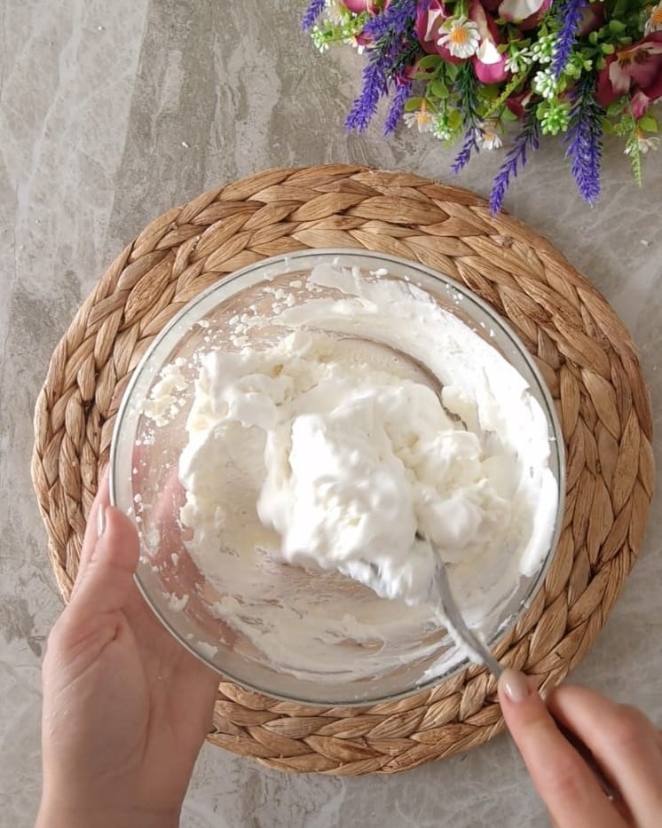 Dans un grand bol, mélangez la ricotta avec le sucre glace, incorporez également la crème fouettée, mélangez délicatement sans démonter la crème.