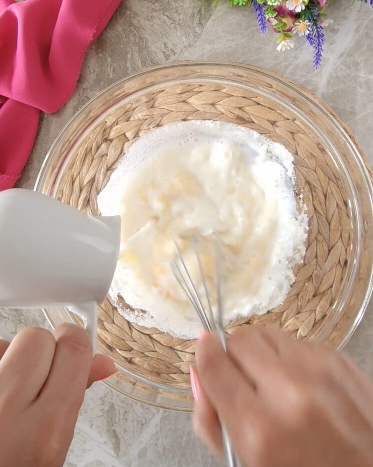 Avec un fouet, dans un grand bol, battez l’œuf avec le sucre.