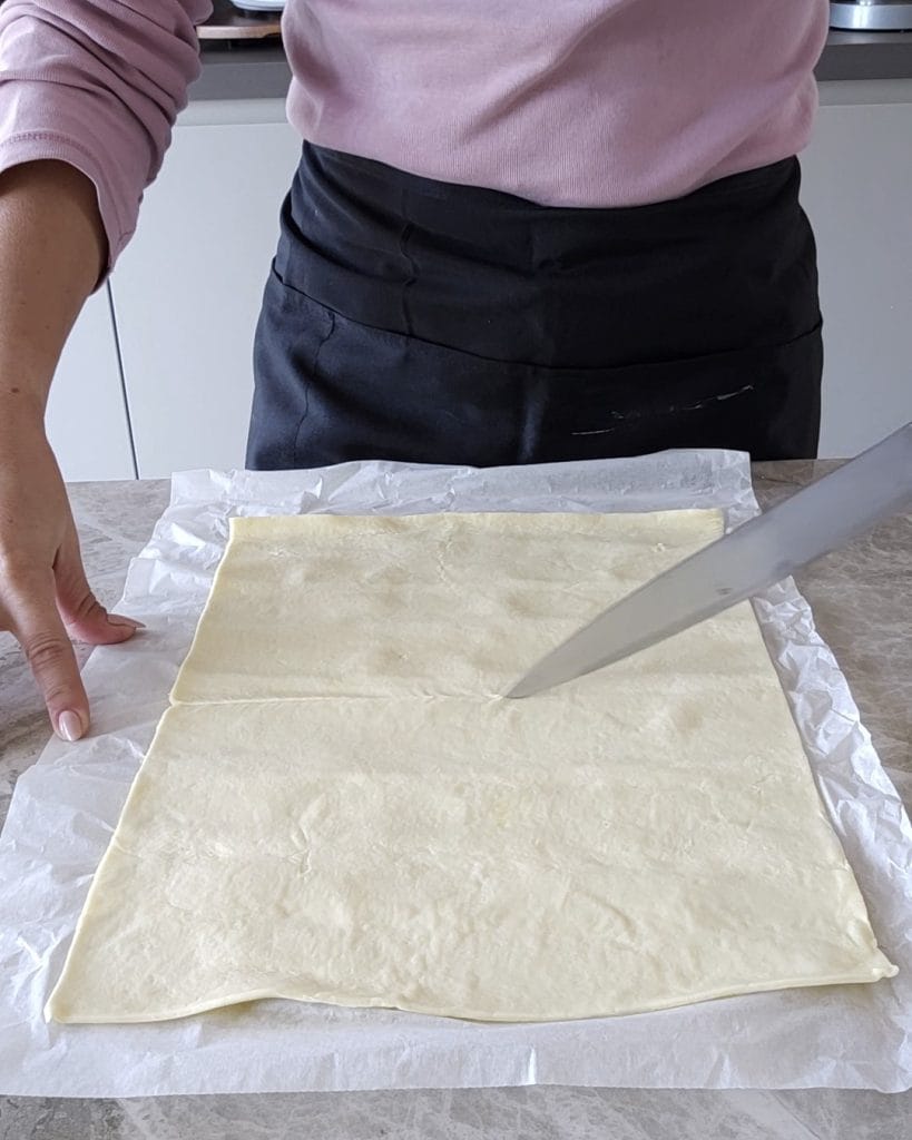 Prenez un rouleau de pâte feuilletée, étalez-le et divisez-le en deux.
