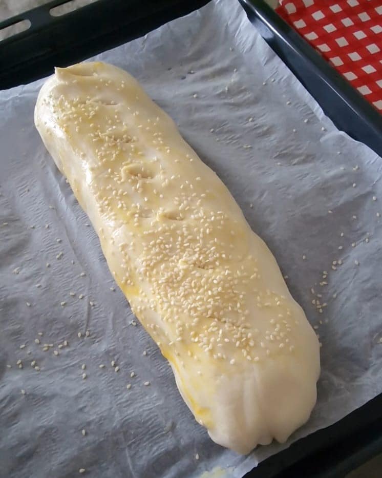 À ce stade, badigeonnez la surface avec l’œuf battu et faites cuire à 190°C pendant environ 30 minutes ou jusqu’à ce que ce soit doré.