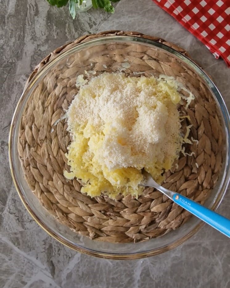 Ajoutez aux pommes de terre chaudes, le sel, le fromage râpé et l’œuf, puis mélangez le tout.