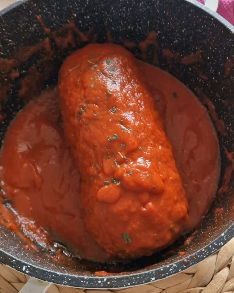 Après le temps de repos, disposez le pain de viande dans la casserole assaisonnée d’un filet d’huile d’olive extra vierge. Puis versez-y le coulis de tomate chaud.