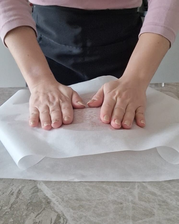 Ensuite, étalez la viande entre deux feuilles de papier sulfurisé et avec le rouleau, réalisez un rectangle.