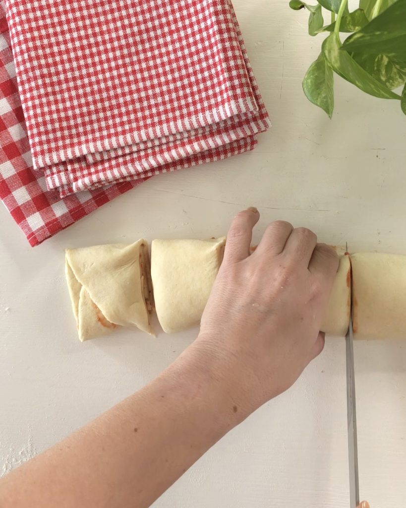 • Coupez en morceaux de 4 cm de hauteur et disposez-les bien espacés dans un moule à couronne bien huilé, puis sur chaque petit cylindre posez une demi-tomate cerise, laissez lever encore 20 minutes.