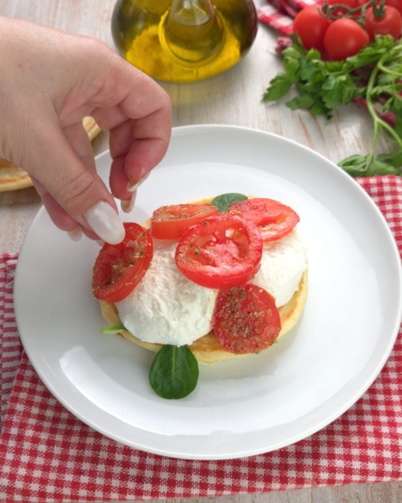 Garnissez les pancakes de mâche, mozzarella, tomates cerises assaisonnées de sel, d’origan et d’huile, et de jambon.