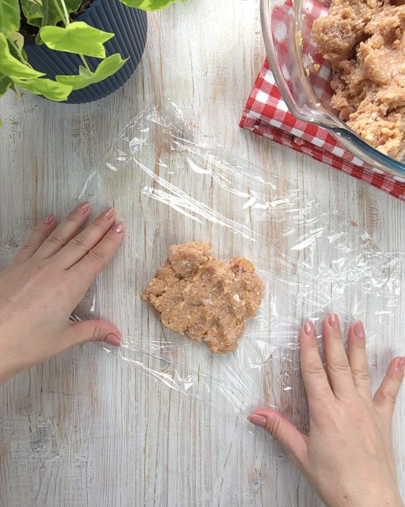 • Étalez la viande enveloppée dans du film alimentaire et aplatissez la viande avec le rouleau à pâtisserie.