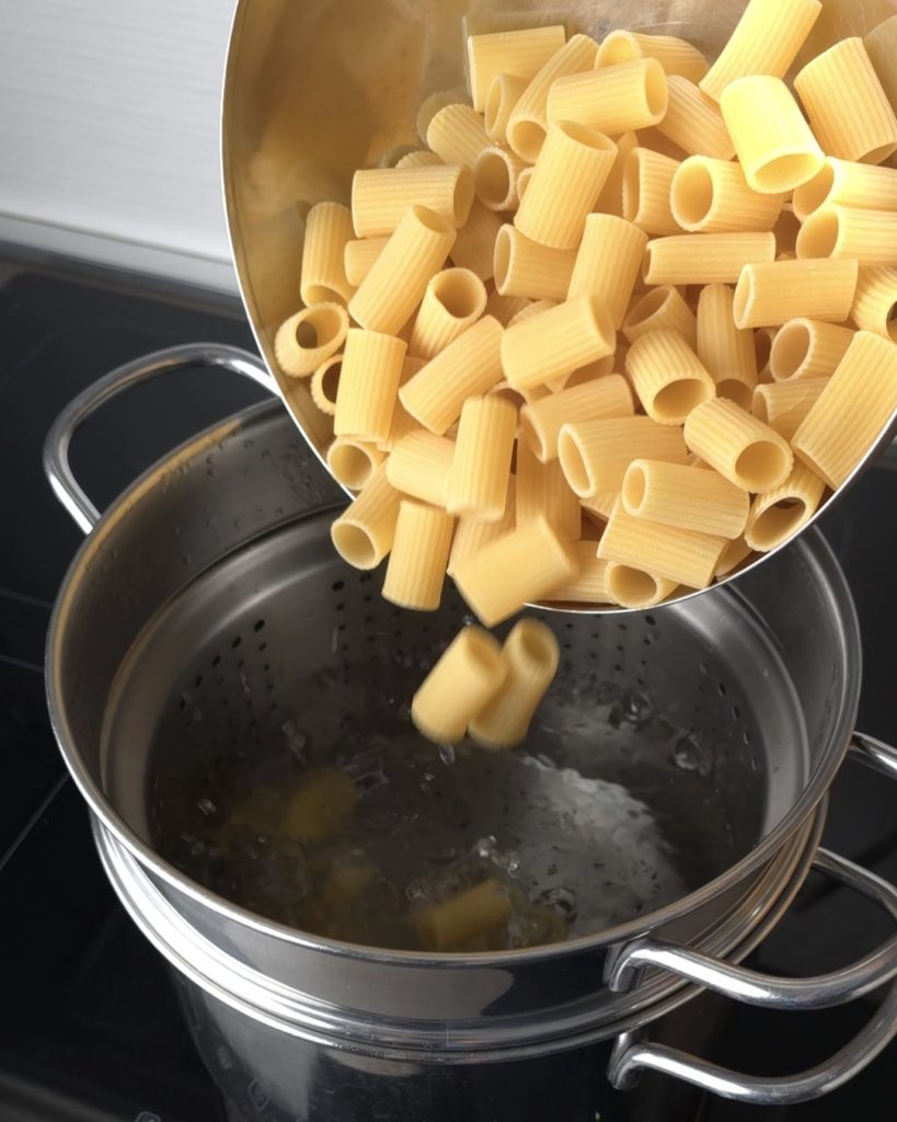 Faites cuire les pâtes dans l’eau bouillante salée. Entre-temps, prenez les pommes de terre déjà cuites, ajoutez le sel, le poivre et le lait.,