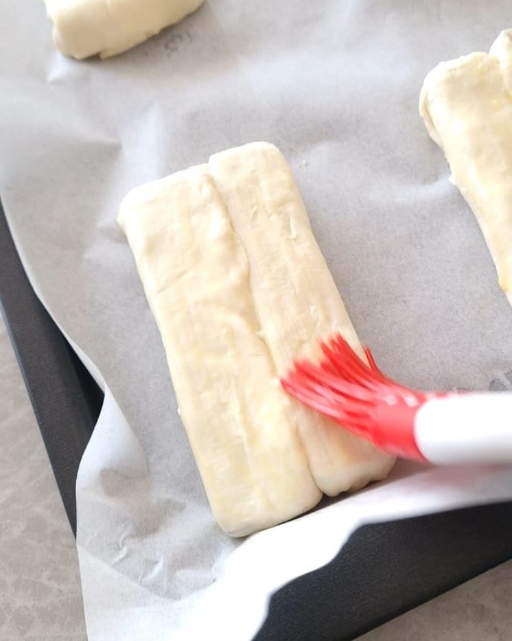 À ce stade, divisez la pâte feuilletée en quatre rectangles contenant chacun deux barres.