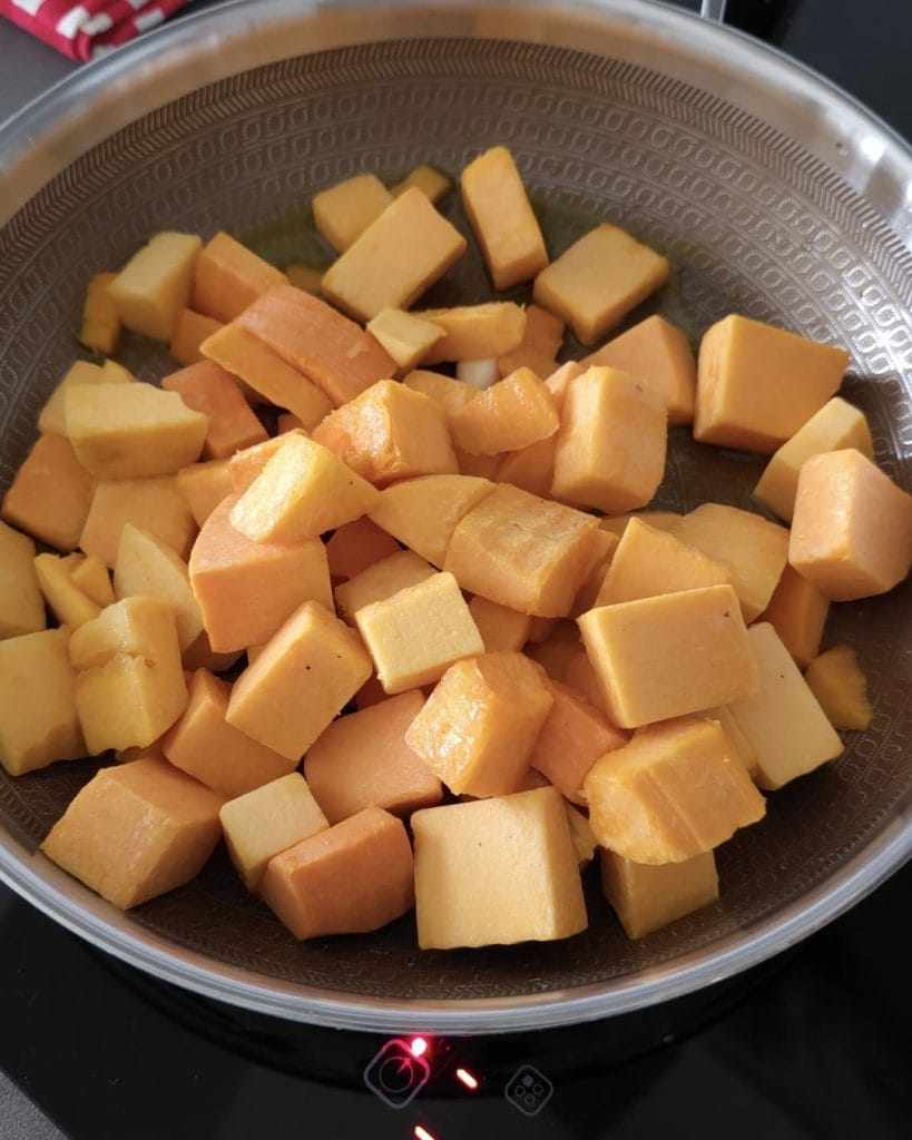 Commencez par nettoyer la courge, d’abord en retirant les graines puis la peau, ensuite coupez-la en dés, puis faites-la revenir à la poêle avec un filet d’huile et une gousse d’ail.