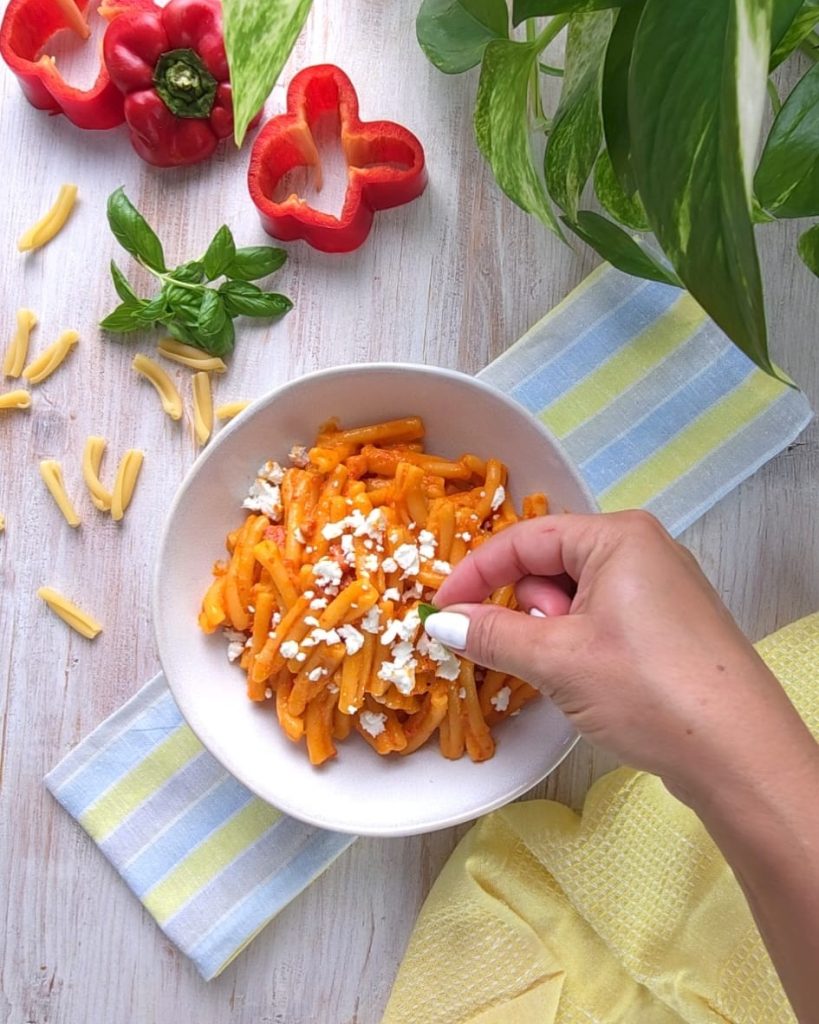 Pâtes à la crème de poivrons et feta, un plat principal fabuleux, riche en saveurs et très simple à préparer. Si vous aimez ce légume, essayez aussi les poivrons farcis à la viande, les roulés farcis de saucisse ou la tarte salée à la scamorza.