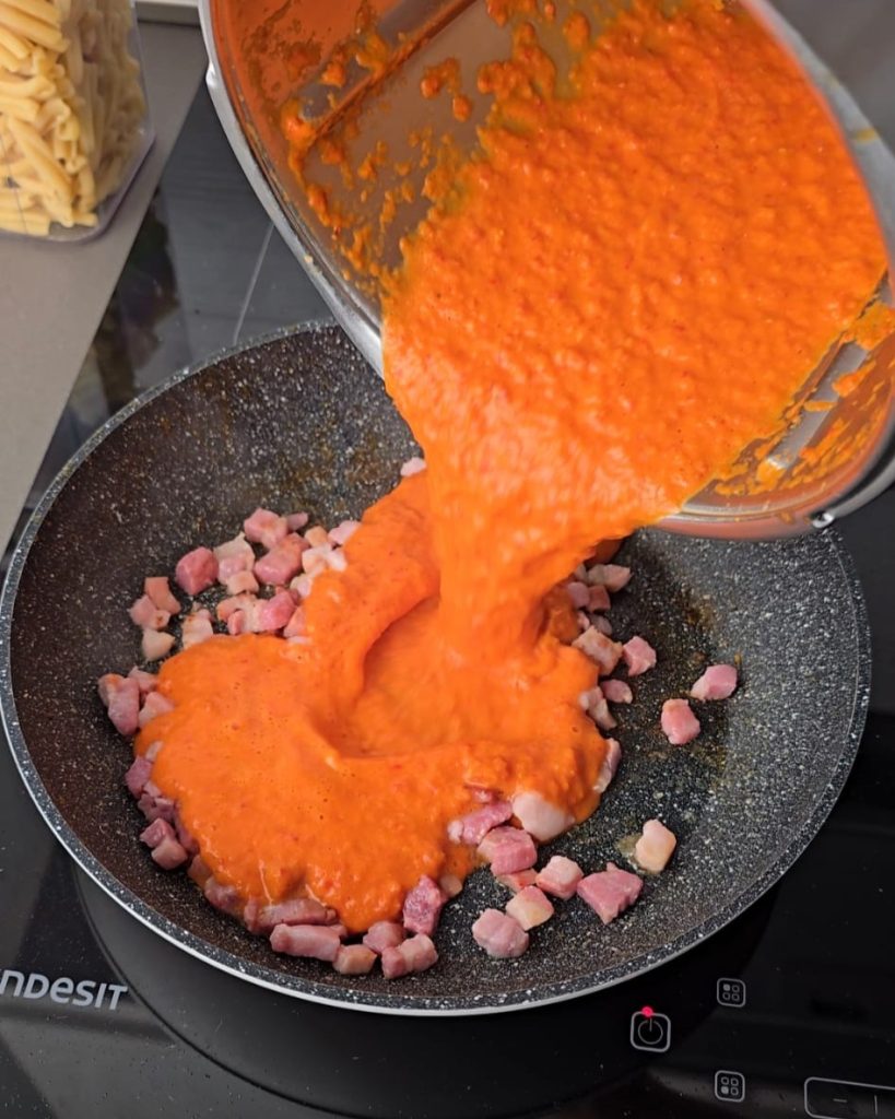 Entre-temps, faites bien revenir dans la même poêle la pancetta coupée en dés. Transférez la crème obtenue avec la pancetta, ajoutez également les pâtes cuites et mélangez.