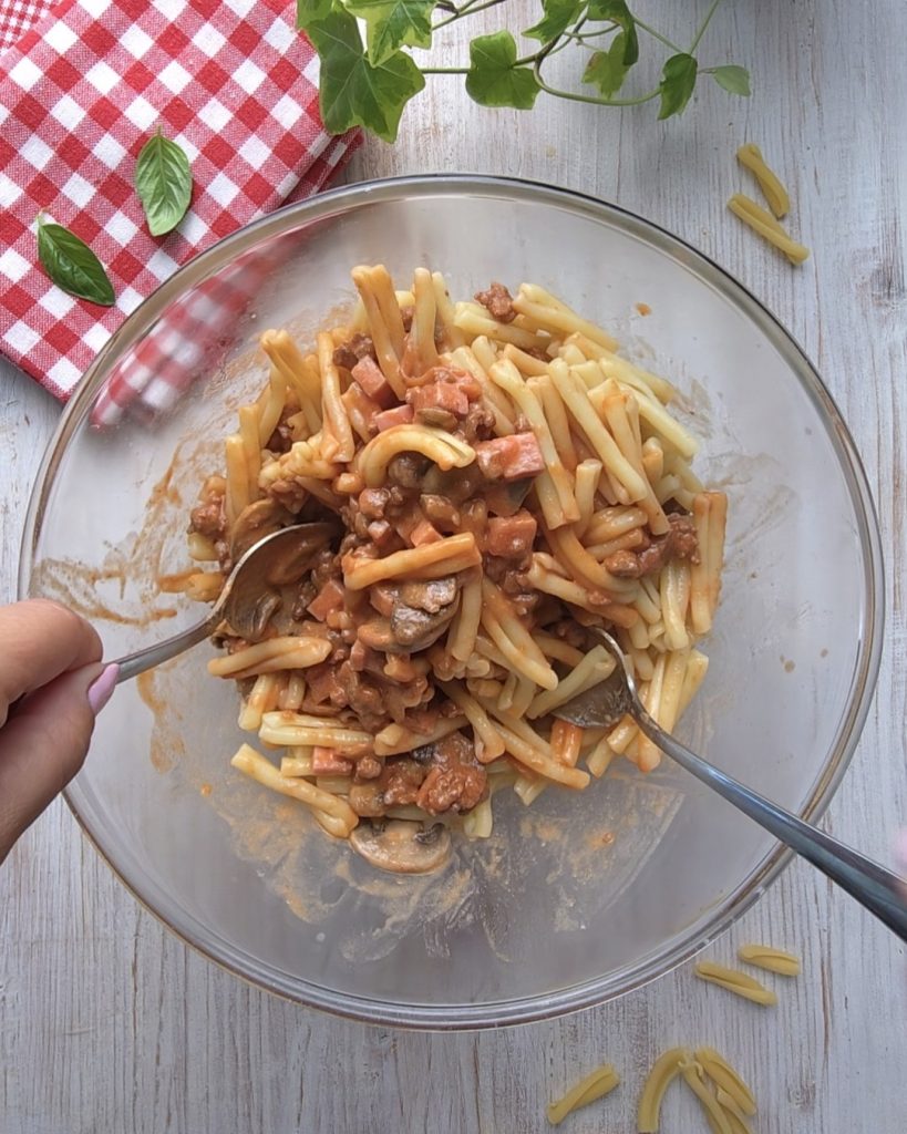 • Ajoutez les champignons au reste de la sauce et mélangez. Pendant ce temps, faites cuire les pâtes dans de l’eau bouillante salée pendant le temps de cuisson.