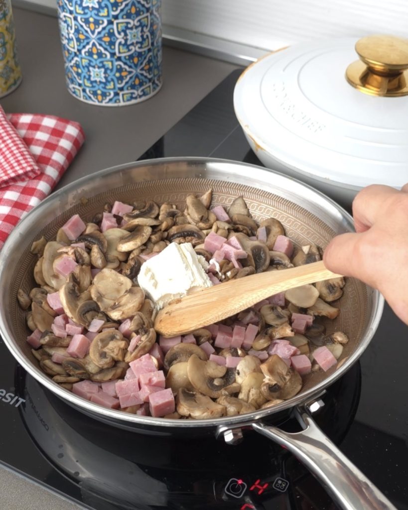 • Dans une autre poêle, faites revenir une gousse d’ail avec de l’huile, ajoutez les champignons, salez et poivrez, puis ajoutez le jambon cuit et faites cuire 7-8 minutes, ajoutez la robiola et laissez fondre.