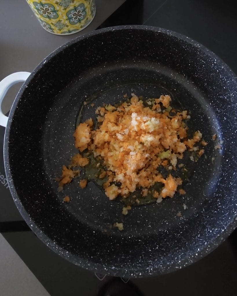 Émincez le céleri, la carotte et l’oignon, puis faites revenir dans une poêle avec un filet d’huile et une gousse d’ail.