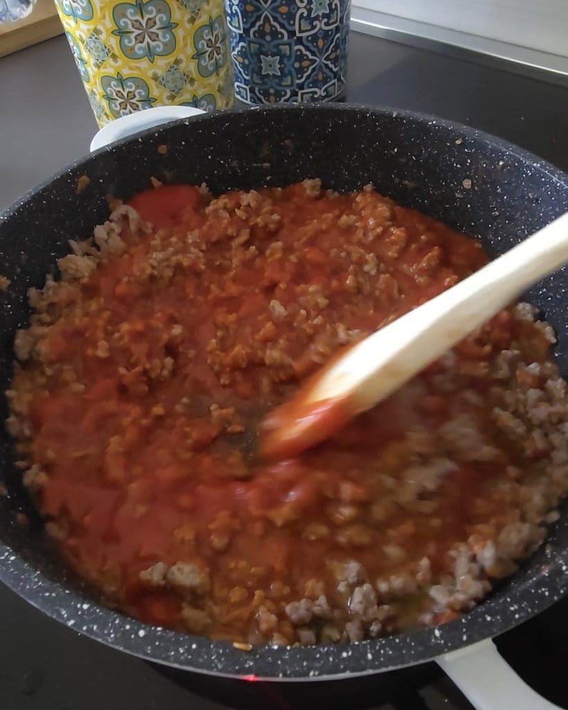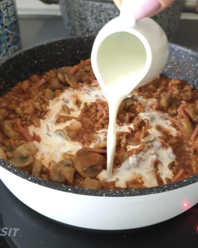 Ajoutez les champignons et le speck à la sauce de viande et de tomate et mélangez. Ajoutez la crème fraîche liquide et terminez la cuisson pendant encore 2-3 minutes.