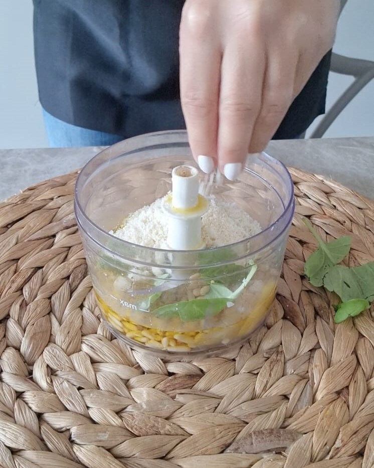 Ensuite, retirez la peau avec un éplucheur, à ce stade mettez-le dans un mixeur et ajoutez le reste des ingrédients : jus de citron, pignons, basilic, ail et parmesan.
