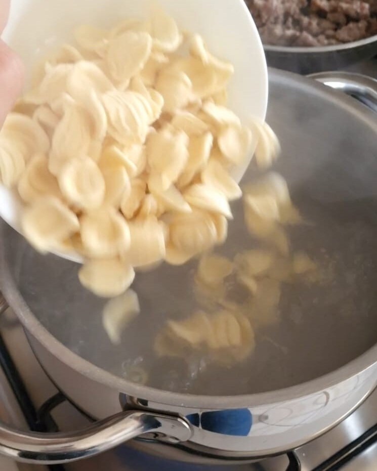 Faites bouillir l’eau des pâtes puis, ajoutez les orecchiette et laissez cuire le temps indiqué sur l’emballage.
