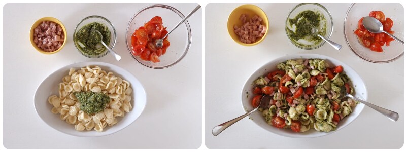 Assaisonnez les orecchiette avec le pesto, ajoutez les tomates cerises et le jambon cuit coupé en dés.