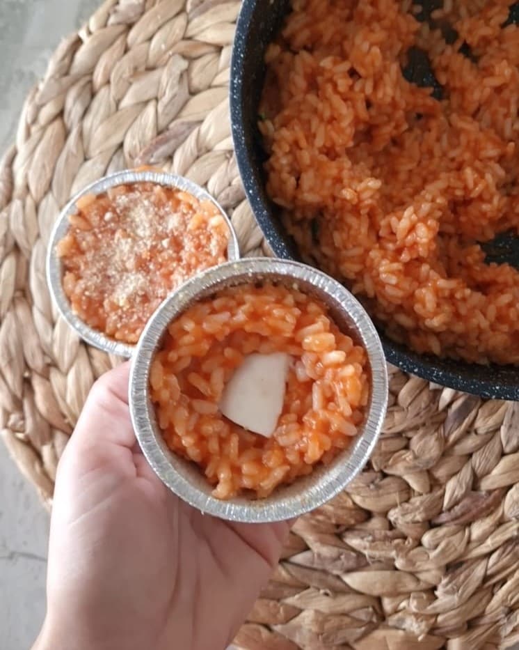 Huilez les moules et saupoudrez-les de chapelure, remplissez-les avec le riz. Au centre du moule, insérez un morceau de mozzarella et recouvrez avec le reste du riz.