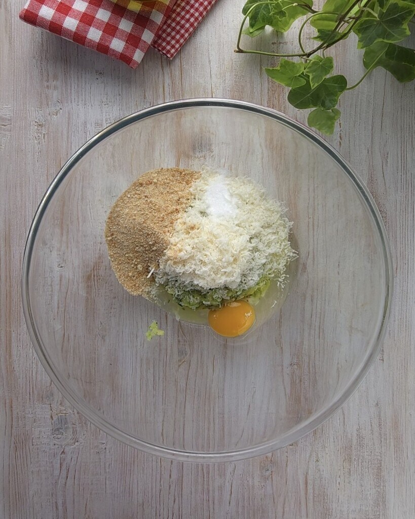 Une fois cuites, mettez les courgettes dans un grand bol, puis ajoutez le parmesan, le sel, la chapelure et l’œuf, puis mélangez et écrasez avec les mains.