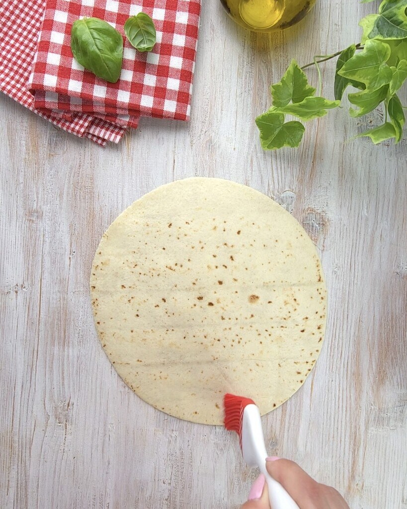 À ce stade, badigeonnez le bord de la piadina du côté que vous allez plier, avec de l’eau tiède.