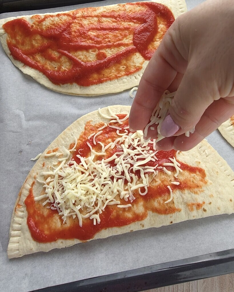 Garnissez les piadines avec la sauce tomate et la mozzarella râpée, pliez la piadina en deux et, avec une fourchette, scellez les extrémités pour réaliser la piadi calzone.