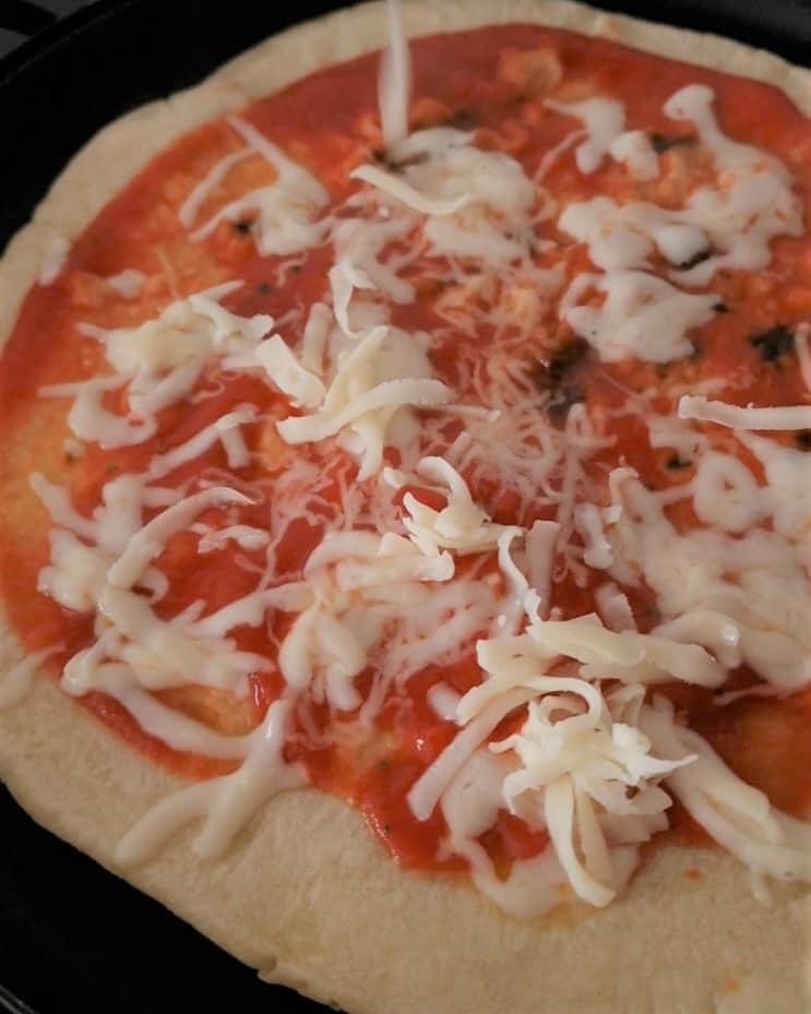 Retournez de l’autre côté puis garnissez avec de la sauce tomate assaisonnée de sel, d’huile, et d’origan, enfin ajoutez la mozzarella.