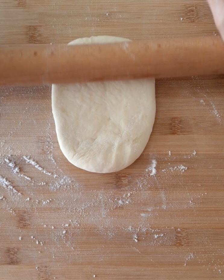 Après le temps de repos, divisez la pâte en 5 boules, puis avec le rouleau à pâtisserie, étalez vos piadines en formant des disques fins.