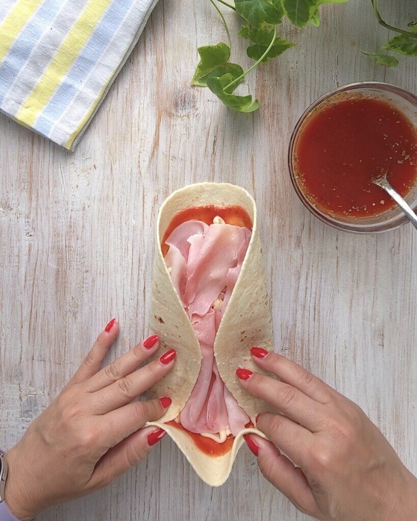 Préparez la piadina et posez-la sur le plan de travail, puis garnissez avec la sauce tomate, le jambon cuit, et la mozzarella râpée.