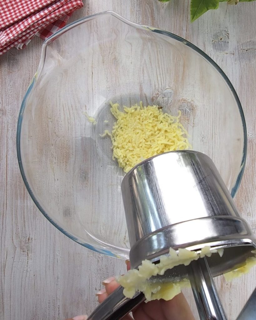 Coupez les pommes de terre en morceaux, puis faites-les cuire dans de l’eau bouillante salée ; à la fin, lorsqu’elles sont tendres, écrasez-les dans un bol.
