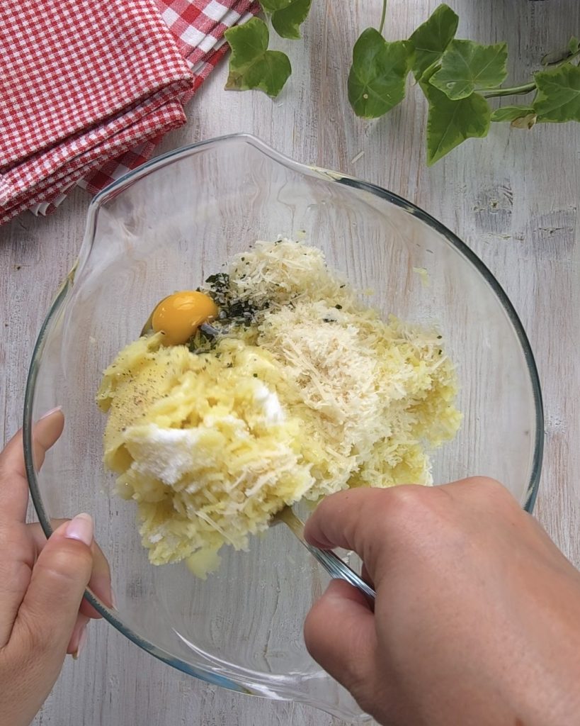 Ajoutez le sel, le parmesan râpé et l’œuf, puis mélangez bien avec la fourchette.