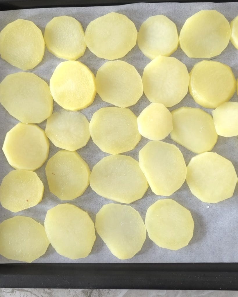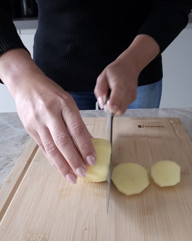Commencez par éplucher les pommes de terre, puis coupez-les en tranches pas trop épaisses, en essayant de les faire toutes de la même taille.