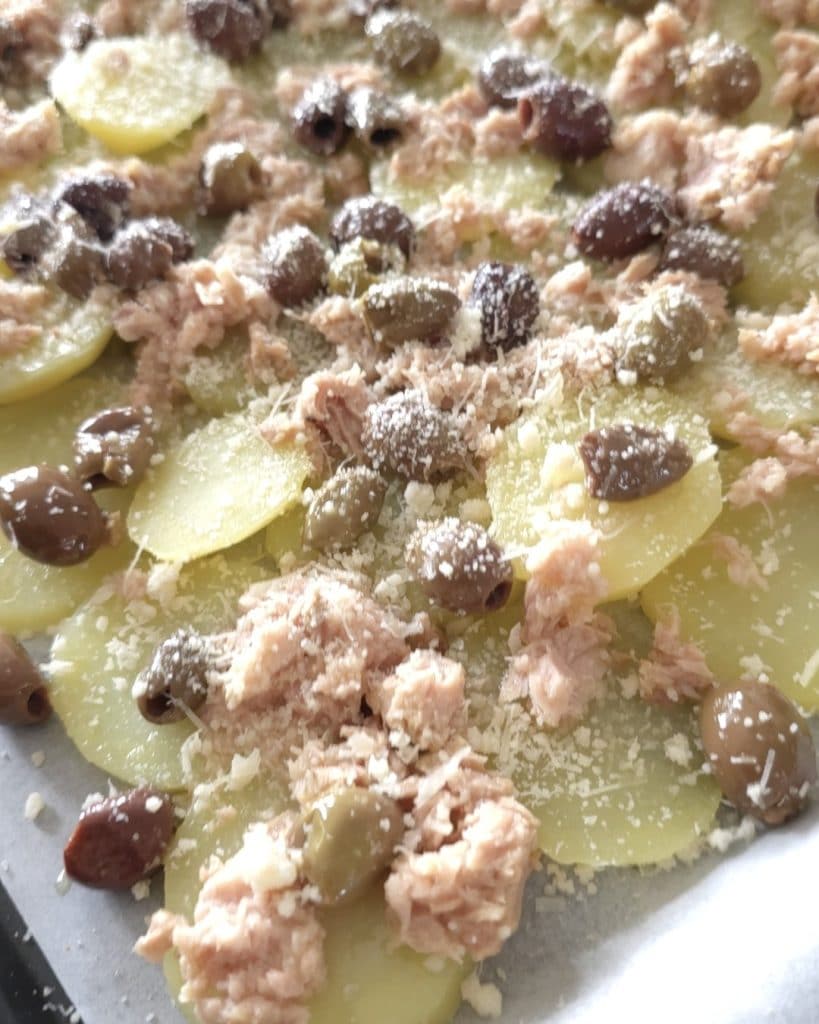 Ajoutez le thon égoutté, les olives, le parmesan râpé et un filet d’huile, puis faites cuire à 180°C pendant environ 15 minutes ou jusqu’à ce qu’elles soient gratinées.