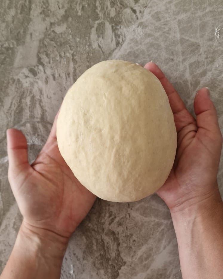 Transférez la pâte dans un bol, couvrez avec un film plastique et laissez lever jusqu’à ce que la pâte double de volume, dans le four éteint avec la seule lumière allumée, cela prendra environ 2 heures.
