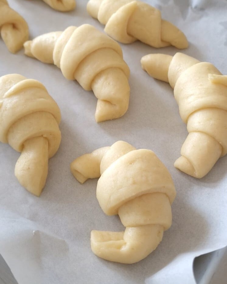 À ce stade, avec un couteau à lame lisse, réalisez des triangles réguliers, qui seront ensuite roulés pour former les croissants.