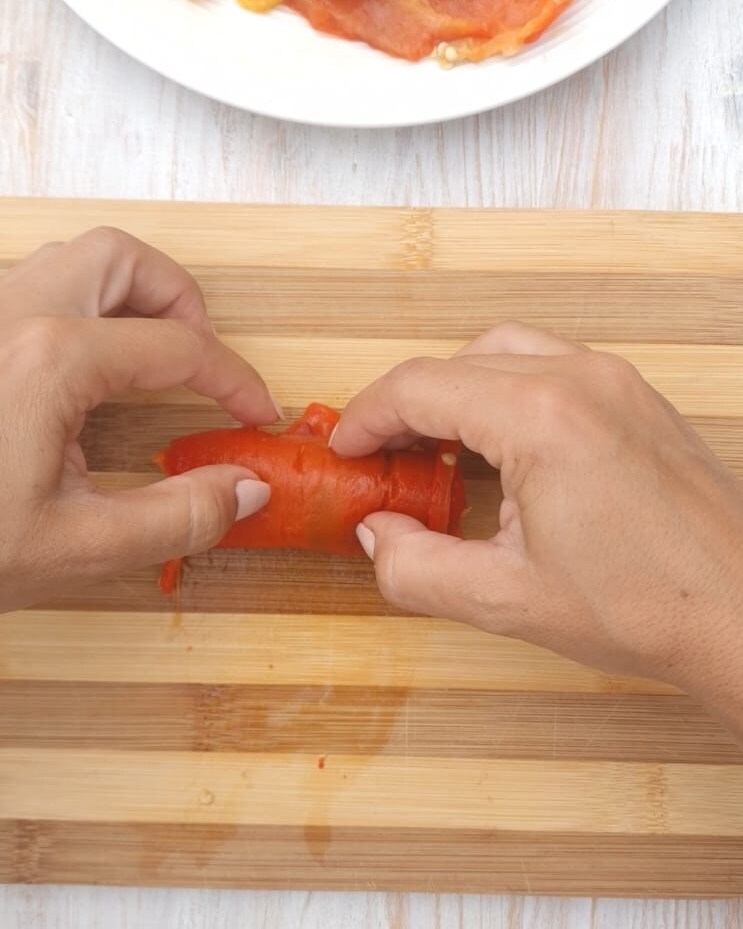 Farcissez chaque tranche de poivron avec la saucisse en les enroulant sur elles-mêmes.