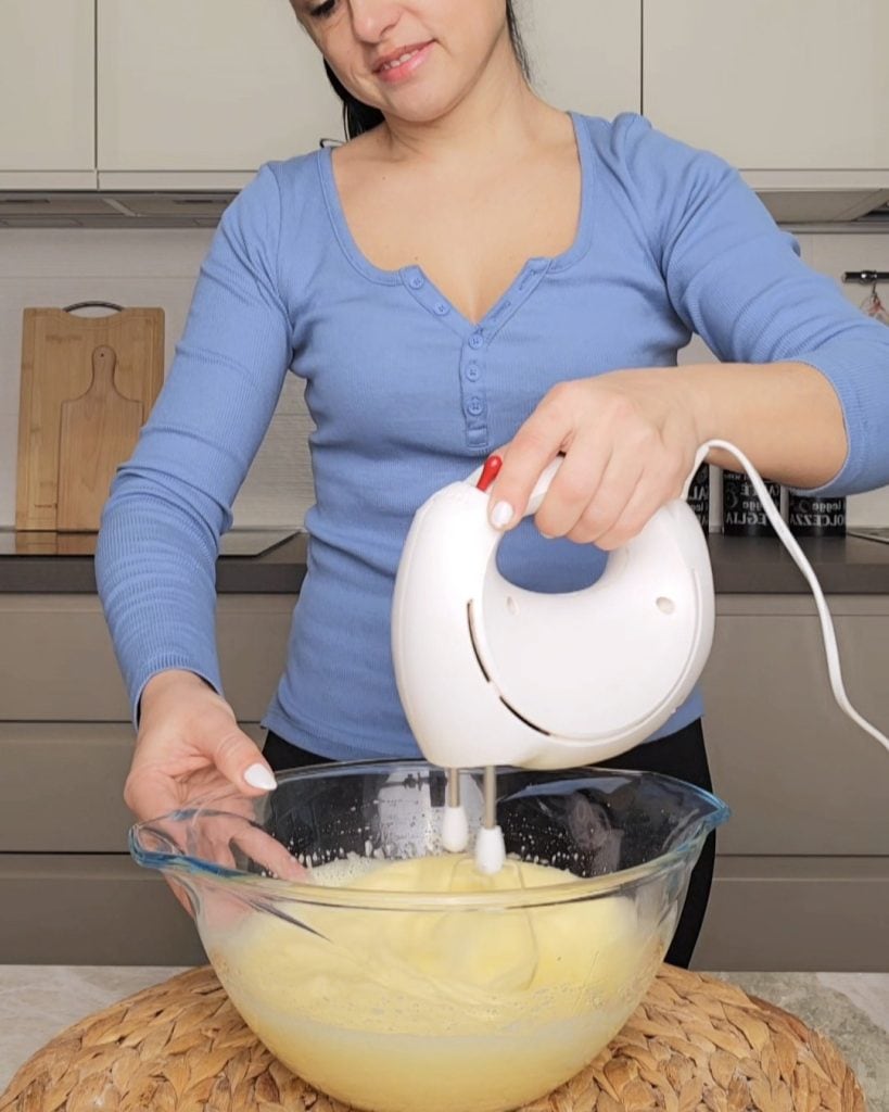 Dans un grand bol, fouettez les œufs avec le sucre. Battez avec le mixeur électrique jusqu’à ce qu’ils soient bien gonflés.