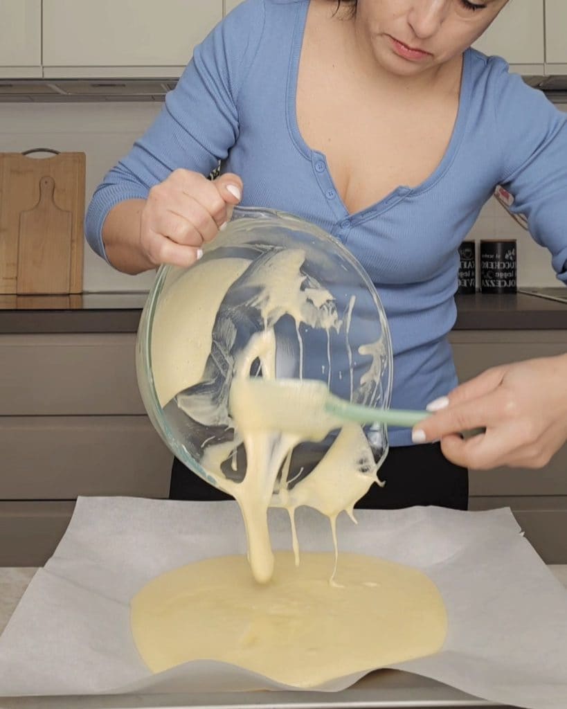 À ce stade, ajoutez la farine tamisée en plusieurs fois. Mélangez très délicatement avec une spatule, en faisant des mouvements circulaires de bas en haut. Versez le mélange dans un moule de 30×40 cm recouvert de papier sulfurisé. Faites cuire dans un four préchauffé en mode statique à 190°C pendant 12 minutes.
