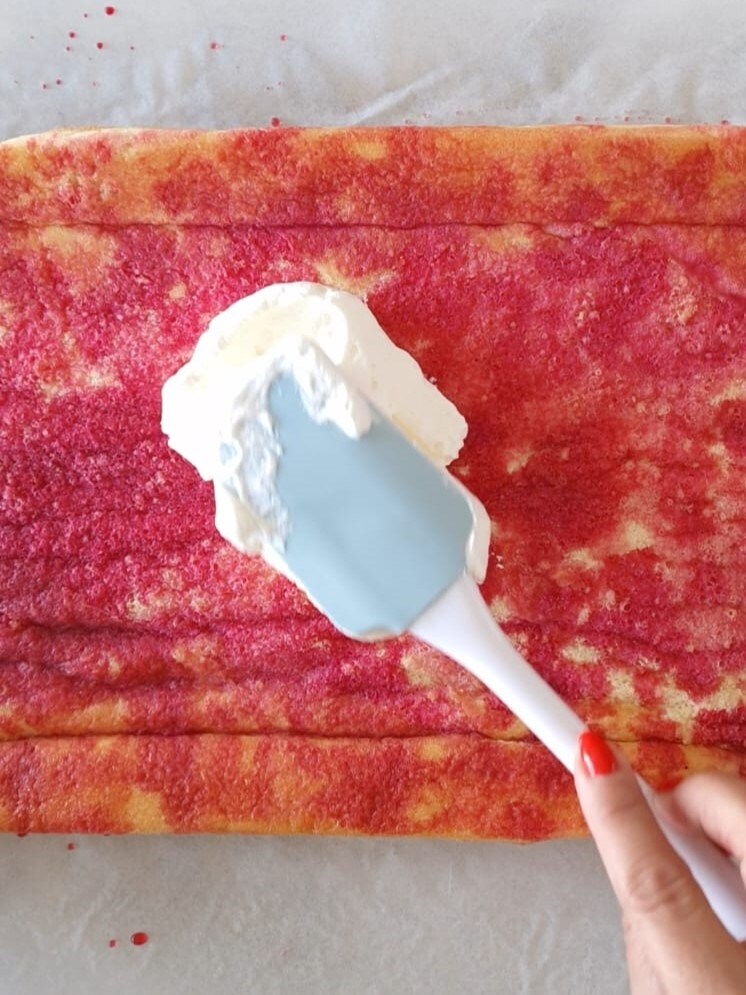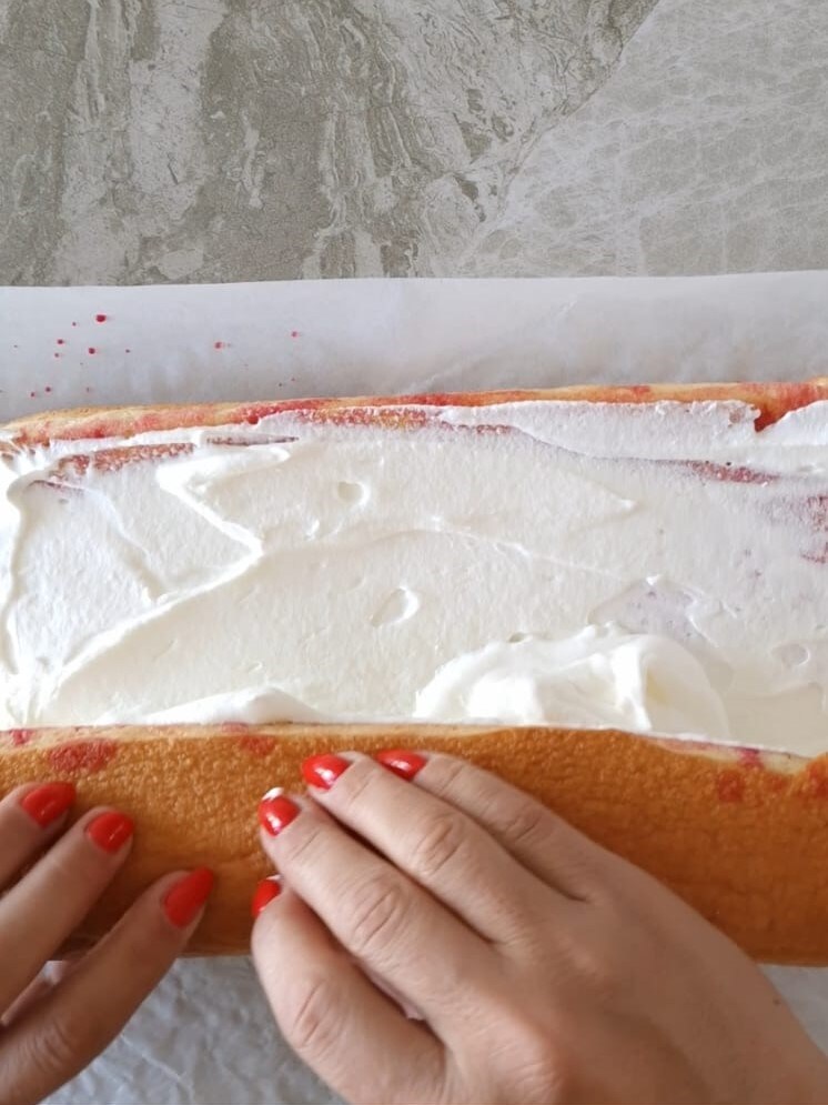 Une fois refroidi, déroulez le roulé et imbibez-le d’alchermes et garnissez-le de crème fouettée avec 1 cuillère de sucre, puis enroulez-le à nouveau.