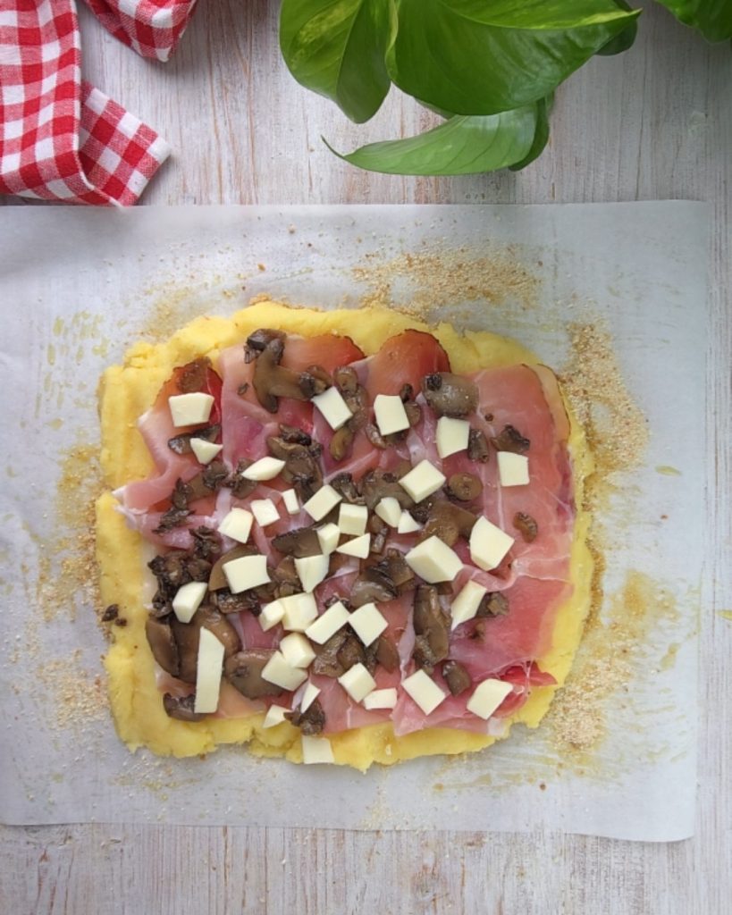 Une fois obtenu un mélange homogène, écrasez-le sur une feuille de papier sulfurisé, bien huilée et saupoudrée de chapelure, en lui donnant une forme rectangulaire. Garnissez avec le speck, les champignons et le fromage.