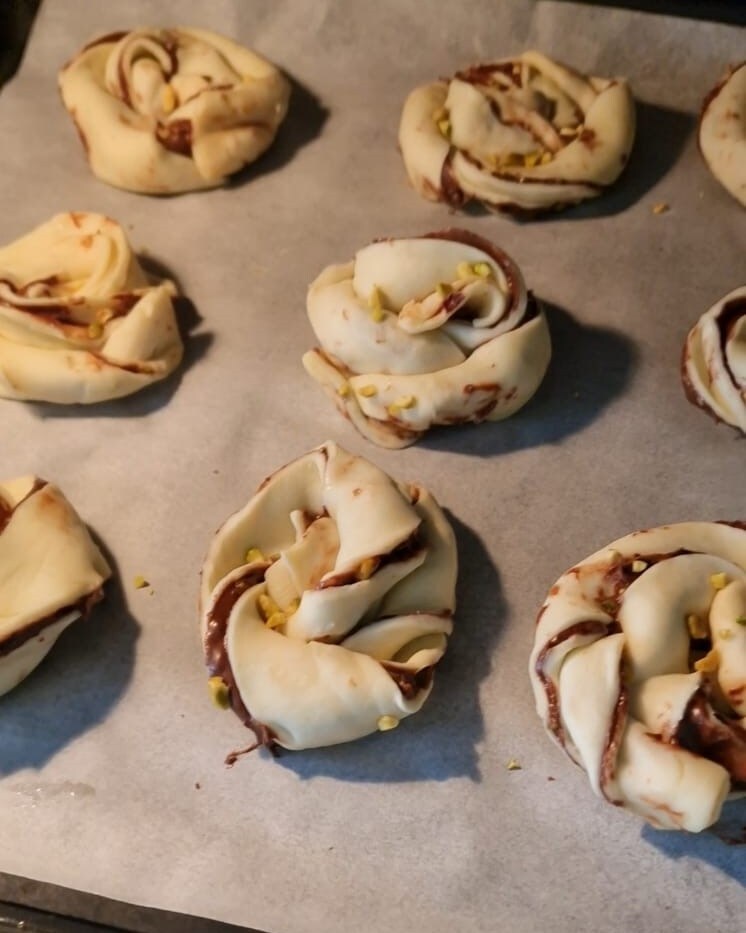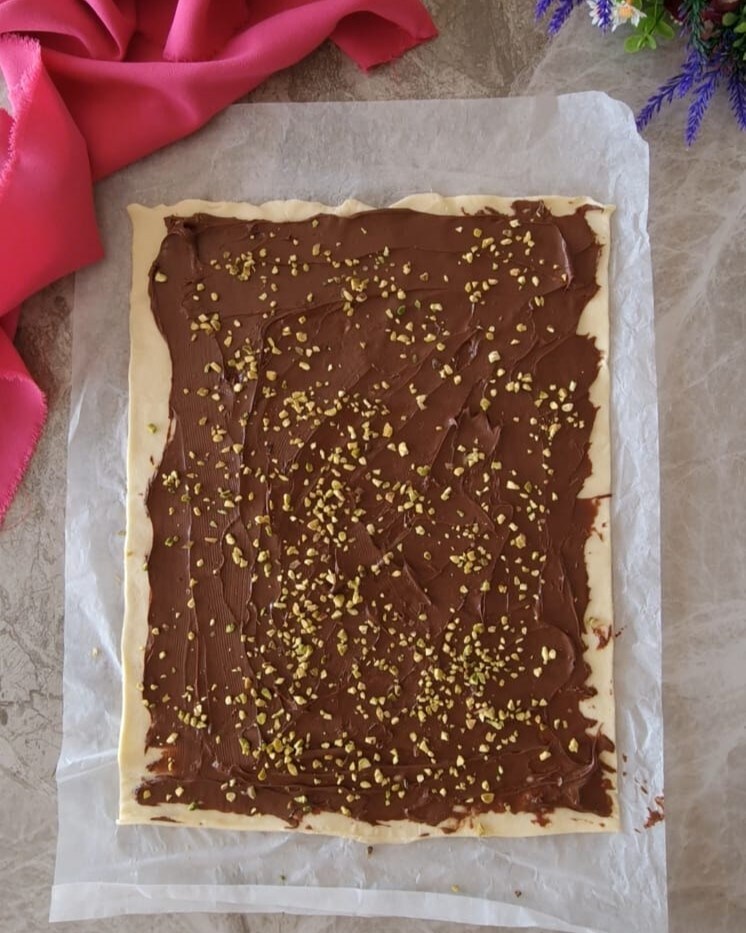 Étalez la surface avec la Nutella, puis ajoutez également les éclats de pistaches, puis refermez avec le second rouleau de pâte feuilletée.