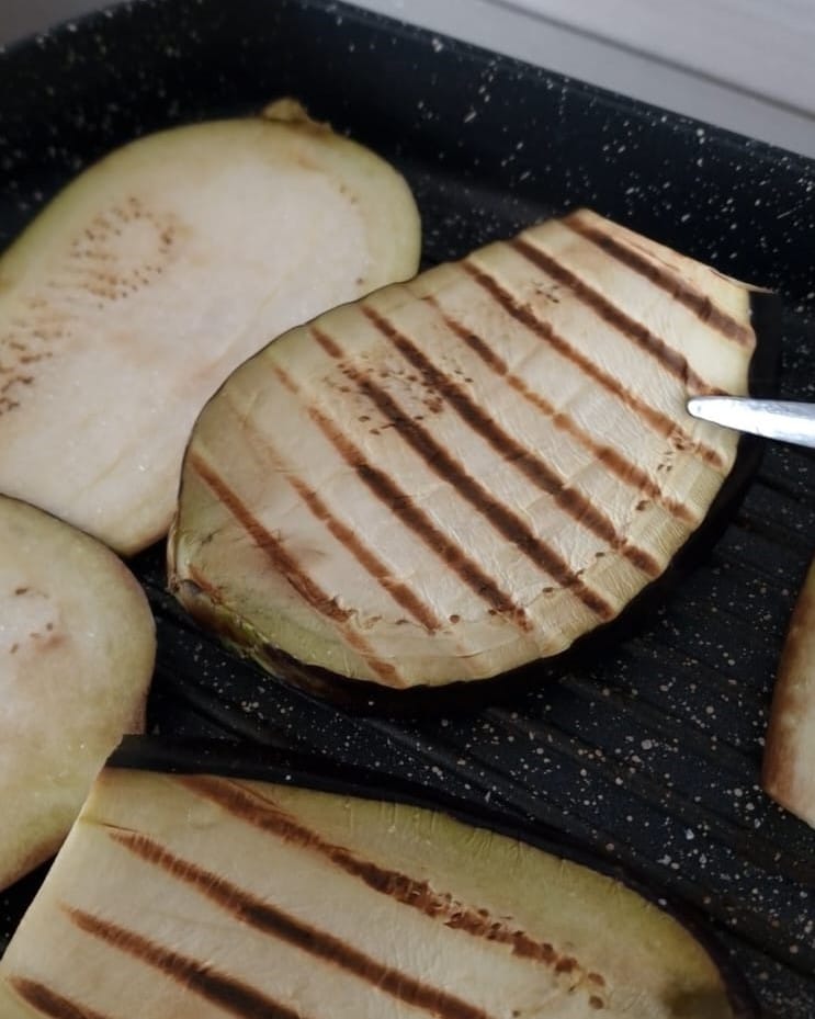 • Lavez et coupez la tige des aubergines, puis coupez-les en tranches pas trop épaisses, (environ 1cm suffit).
