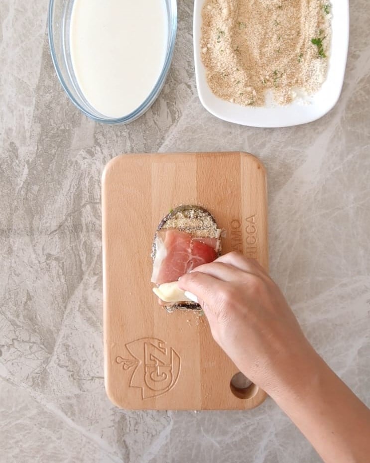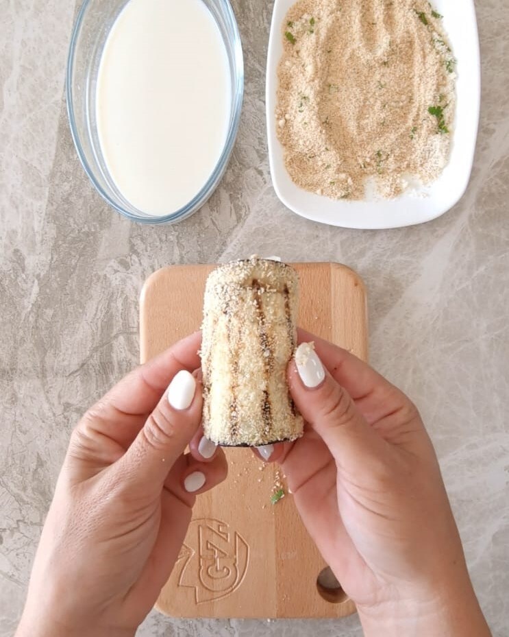 • Prenez les tranches d’aubergines et passez-les d’abord dans le lait, puis dans la chapelure.