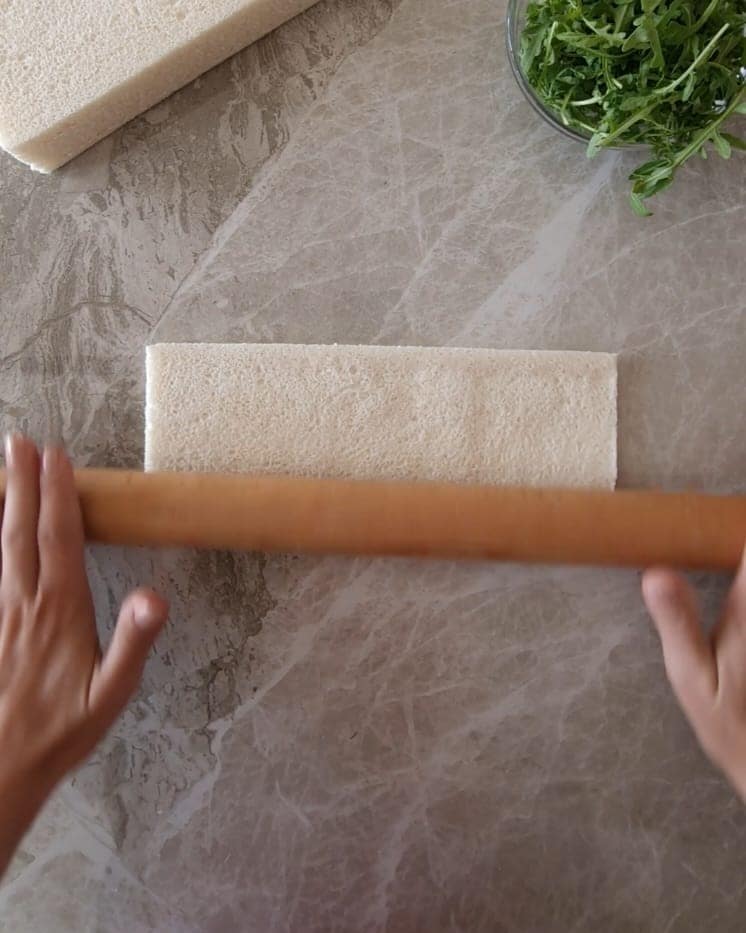 Prenez le pain de mie et aplatissez-le avec un rouleau à pâtisserie sur le plan de travail.
